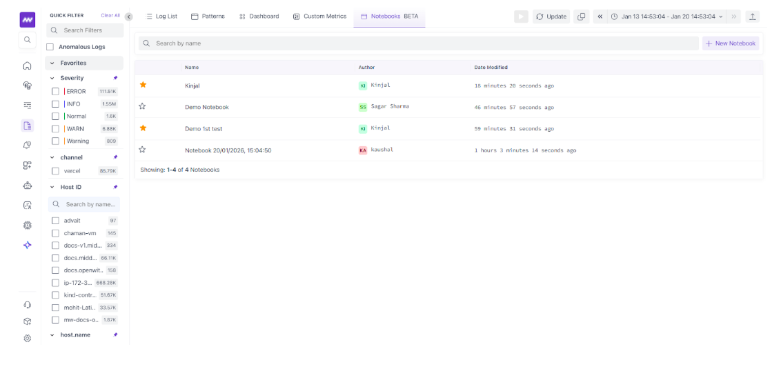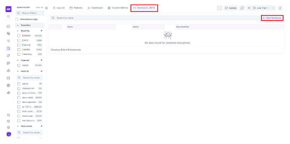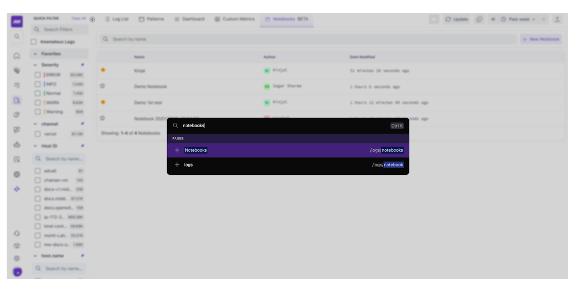 To open Notebooks, go to Logs → Select Notebooks from the top navigation. Here, you will find list of previously created Notebooks in addition to option for creating a new Notebook.