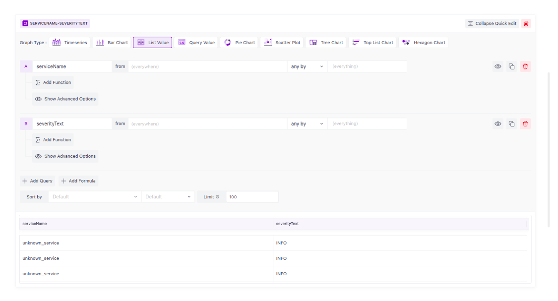 serviceNameorseverityText - Aggregation: Options like